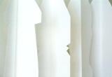 Elementos utilizados: grandes sacos em tecido suspensos com recortes em sua superfície, um saco em tecido no formato de um coador com elementos metálicos oxidados em seu interior, objetos suspensos em papel recortado e dobrado, prateleiras de madeira pintada, objeto em papel contendo elementos metálicos oxidados em seu interior, camisetas contendo elementos metálicos oxidados em seu interior, cabides, suportes metálicos, suporte de madeira pintada com louça contendo pó de ferrugem, fotografia de unhas recortadas dentro de caixa de madeira pintada. |